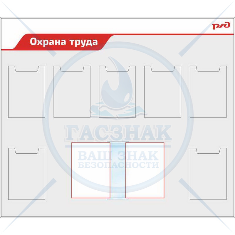 Стенд Охрана труда. ( Пластик ПВХ 4 мм 1250х950; Алюминиевый профиль; 8 карманов А4)